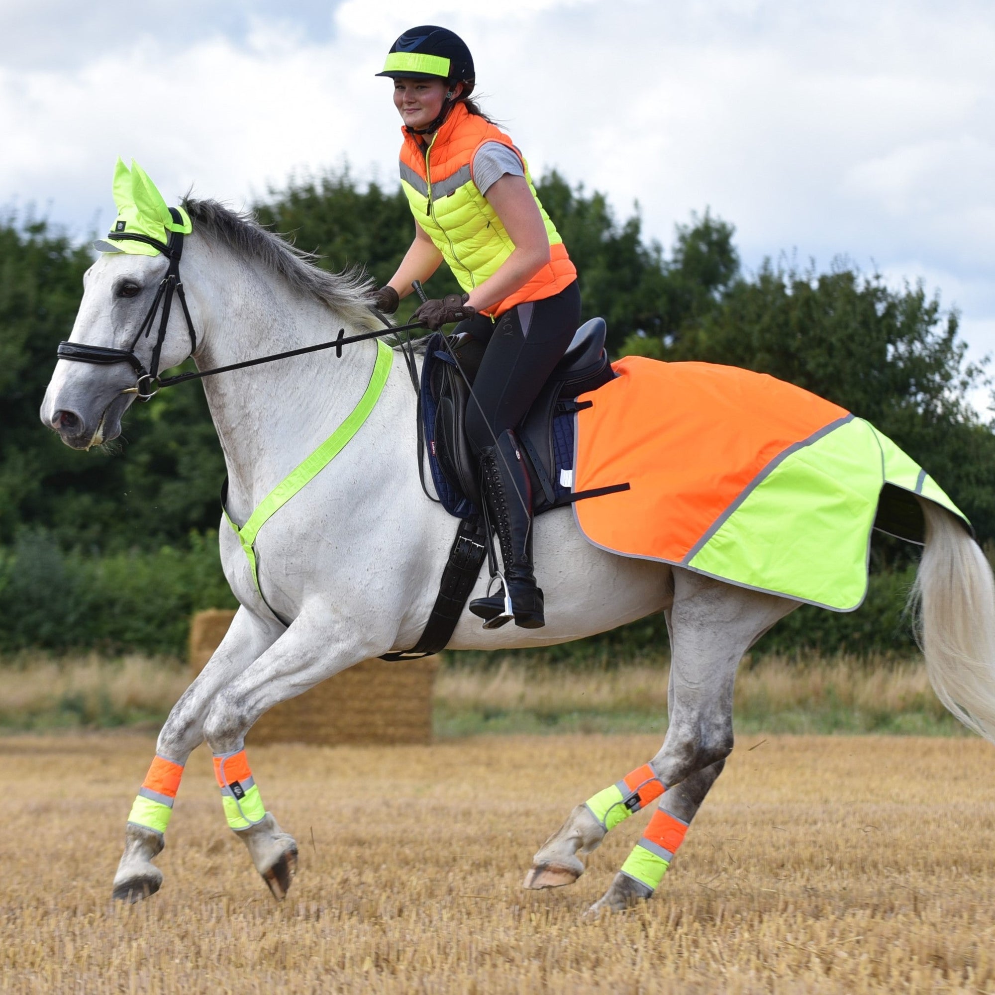 Horse high-vis accessories are essential for road safety — they make horses more visible from every angle, helping drivers recognise and react sooner. The bright, reflective designs catch the eye, make the horse appear larger and more noticeable, and stand out as something unusual on the road — all vital details that can prevent accidents and save lives.